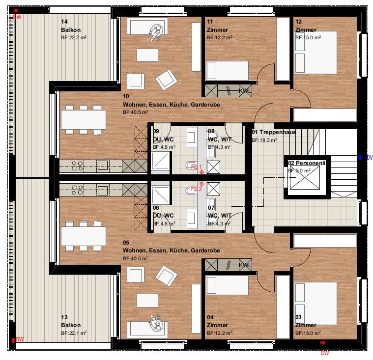 3 1/2 Zi Wohnungen 1. OG Wohnung NW vermietet Zwei Wohnungen im 1. OG77.8 m2Wohnen, Essen Küche im gehobenen AusbaustandardGrosszügige LoggiasReduit mit Wäscheturm Wohnung SW vermietet