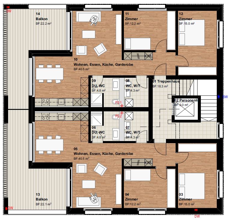 3 1/2 Zi Wohnungen 2. OG Wohnung NW vermietet Zwei Wohnungen im 2. OG77.8 m2Wohnen, Essen Küche im gehobenen AusbaustandardGrosszügige LoggiasReduit mit Wäscheturm Wohnung SW vermietet